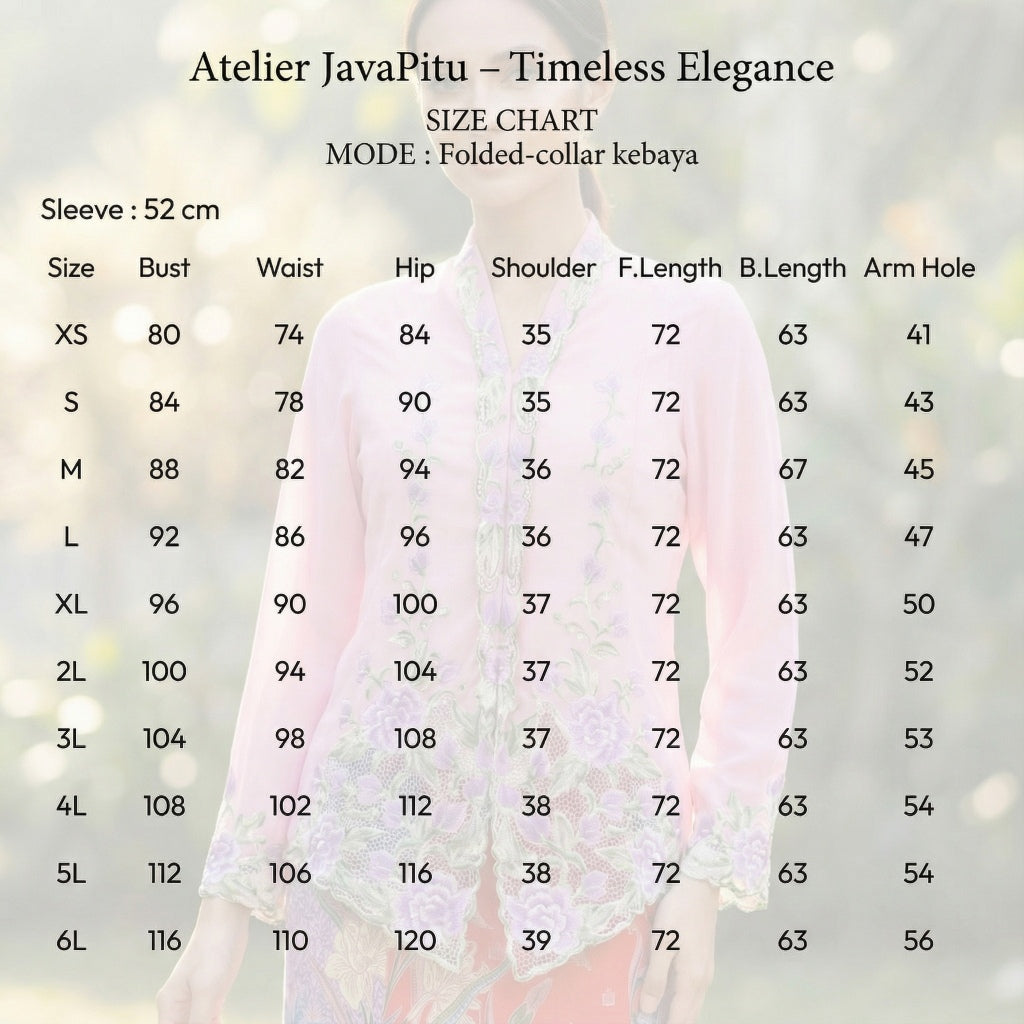 • Cutting kebaya kami lebih kecil dari ukuran standar, harap cek size chart sebelum order